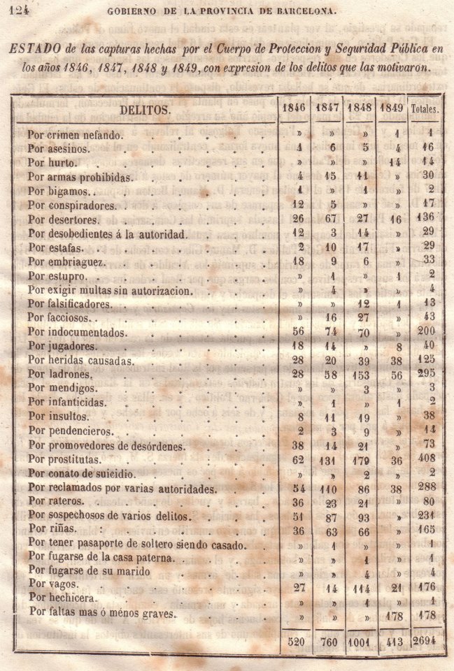 És interessant doncs, veure com la deserció de l’exèrcit, una vida basada en el furt, la prostitució i la ganduleria és el perfil de l’autèntic barceloní de mitjans del XIX, ja que les elits, poc nombroses i que no es veuen reflexades dins aquestes estadístiques, i la resta del proletariat, el qual treballava una quantitat infernal d’hores i dies sense pràcticament descans, queden exempts de la majoria de delictes que aqui s’hi reflecteixen.